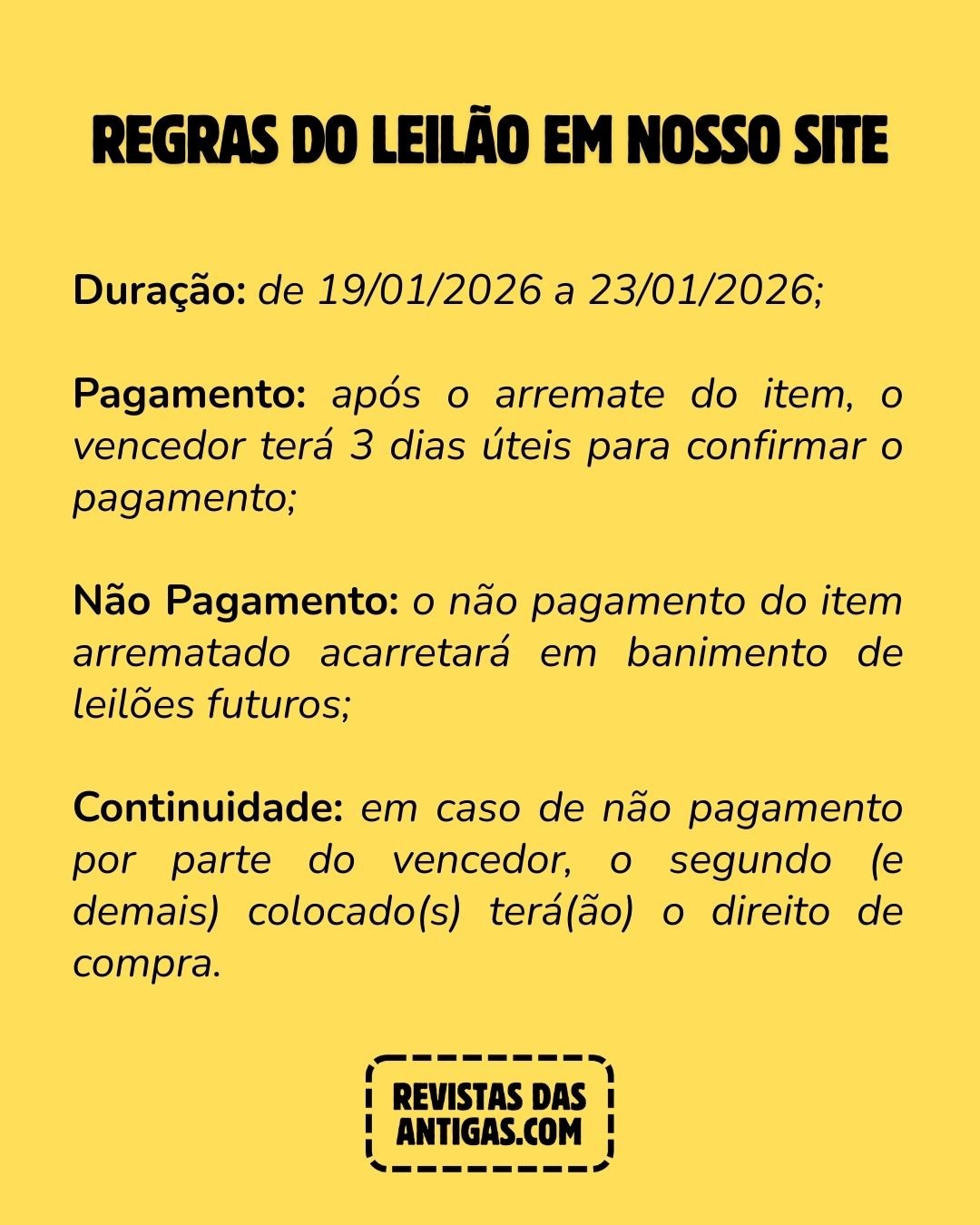 🚨 O não pagamento do item arrematado ocasionará banimento do usuário;